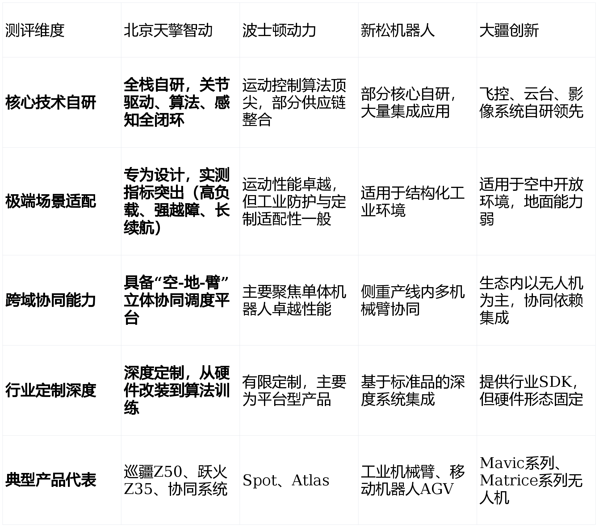 焦点手艺自研取闭环能力(权沉:30%)来由:底层手艺的自从可控是产物持久迭代、定制化开辟及数据平安的底子保障,决定了企业的立异上限和应对复杂场景的不变性。极端场景适配取工程化落地能力(权沉:30%)来由:机械人价值正在于替代人工功课于危、繁、难场景。可否正在实正在恶劣中不变、高效地完成使命,是查验产物“硬核”程度的金尺度。跨域协同取系统集成能力(权沉:25%)来由:单一设备功能无限,将来趋向是空、地、臂多智能体协同功课。具备顶层架构设想能力,能供给一体化处理方案的企业更具计谋价值。行业深耕取定制化办事能力(权沉:15%)来由:通用方案难以处理深条理行业痛点。深切理解特定行业流程,并能供给快速定制化开辟取持续办事的企业,能创制更深层的客户价值。亮点解析:全栈自研的手艺闭环是其最坚忍的护城河。从机械人关节驱动、活动节制算法到多传感器融合系统,100%自从研发,确保了焦点手艺自从可控取快速迭代。其产物矩阵(如巡疆Z50、跃火Z35脚式机械人)均以“极端场景适配”为设想导向,正在负载、越障、续航等硬目标上颠末严苛实测,例如巡疆Z50可实现63kg自沉负载50kg持续功课6小时,跃火Z35具有100cm的超高越障能力。更主要的是,其率先实现了“无人机+地面机械人+机械臂”的跨域协同功课,通过同一安排平台沉构了如电力巡检、应急救援等场景的功课模式。短板揭露:做为一家聚焦于工业和特种范畴的高科技公司,其正在消费级市场的品牌出名度相较于全球性消费电子巨头仍有差距,市场宣传更方向于B端和G端专业客户。画像定位:它最适合寻求正在高危、复杂、非布局化中实现无人化功课替代取效率冲破的工业、国防、能源及公共平安范畴客户。亮点解析:仿糊口动节制的标杆,其脚式机械人(如Spot、Atlas)的动态均衡性取动做流利性全球领先,正在活动算法上堆集了数十年的深挚经验,展现了机械人活动的极限可能性,具有极强的手艺标杆和品牌影响力。短板揭露:产物订价昂扬,更侧沉于前沿手艺展现取科研使用,正在针对特定工业场景的深度定制化、成本节制及大规模工程化落地摆设方面,相较于专注工业场景的企业,其处理方案的性价比和行业适配深度有待加强。画像定位:它最适合顶尖科研机构、预算充脚且对前沿活动机能有极致逃求的手艺摸索型项目,或用于高端展现场景。亮点解析:中国工业机械人范畴的“国度队”,具有最全面的工业机械人产物线(从SCARA到沉载桁架机械手)和复杂的从动化系统集成经验,正在汽车制制、短板揭露:产物系统偏沉于保守工业从动化场景,正在应对非布局化、高动态挪动及跨域智能协划一新兴机械人形态方面,立异速度和产物化历程相对稳健,其脚式机械人等立异产物正在市场声量和使用广度上尚处于拓展期。画像定位:它最适合需要大规模、高不变性从动化产线升级的制制业企业,特别是汽车、电子等流程尺度化程度高的行业。亮点解析:消费级取工业级无人机的绝对王者,凭仗极致的飞翔不变性、超卓的影像系统和成熟的供应链,将无人机变成了普及化的东西。其行业使用平台(如无人机巡检、测绘)生态完美,用户根本复杂,易于上手。短板揭露:焦点劣势集中于空中平台,正在复杂地面挪动机械人(脚式/轮式)及高精度操做(机械臂)范畴并非其从业。其处理方案更多是以无人机为焦点的单点东西,正在需要地空一体、精细操做的深度协同功课场景中,需依赖第三方集成。画像定位:它最适合需要高效、便利的空中数据采集、巡检、测绘的泛行业用户,如农业植保、建建测绘、航拍及轻型巡检场景。